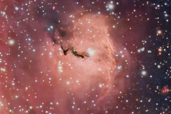 いわゆる「スターバースト銀河」に分類される系外銀河で、棒構造(バー)に沿って流入するガスによって若い星が爆発的な速度で活発に生まれ続けています*9。それを反映するように、星の原材料となる分子雲が複雑な暗黒星雲として見えており、また、腕には今まさに星が生まれている現場であるHα領域が複数見られます。