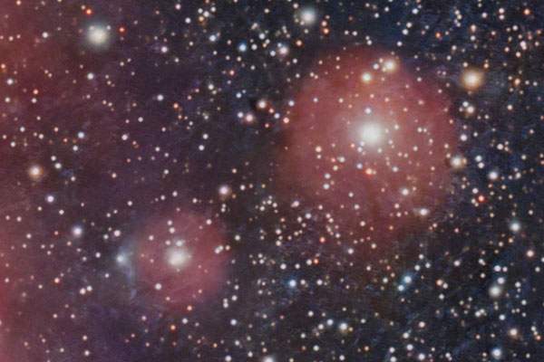 そのすぐ近くには、同じく「しし座I銀河群(M96銀河群)」に属するレンズ状銀河NGC3384(写真左上)が寄り添っています。明るさはM105よりわずかに暗いだけで、望遠鏡でも同じ視野に入るほど近接しているのですが、M105を発見したピエール・メシャンは見逃してしまったようです。