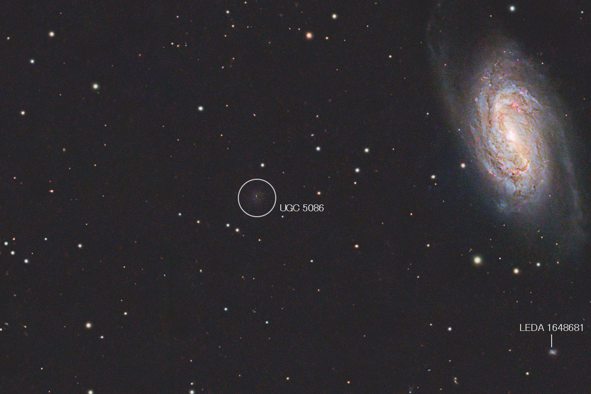 なお、東側(左)には不規則銀河のUDC 5086が見えています。地球からの距離がNGC2903と同程度であることもあり、NGC2903の伴銀河であろうと推定されています。一方、NGC2903のすぐ南側にも銀河らしきものが見えますが、こちらはLEDA 1648681という銀河で、約4億7000万光年の彼方にある無関係の天体です。