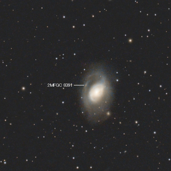なお、解像度不足でこの写真ではもうひとつ形がハッキリしませんが、M96の腕の中に左下から右上に向かって伸びるエッジオンの銀河らしきものが見えています。これは2MFGC 8391という約7億5000万光年彼方の銀河が、手前のM96の腕を透かして見えているものです。